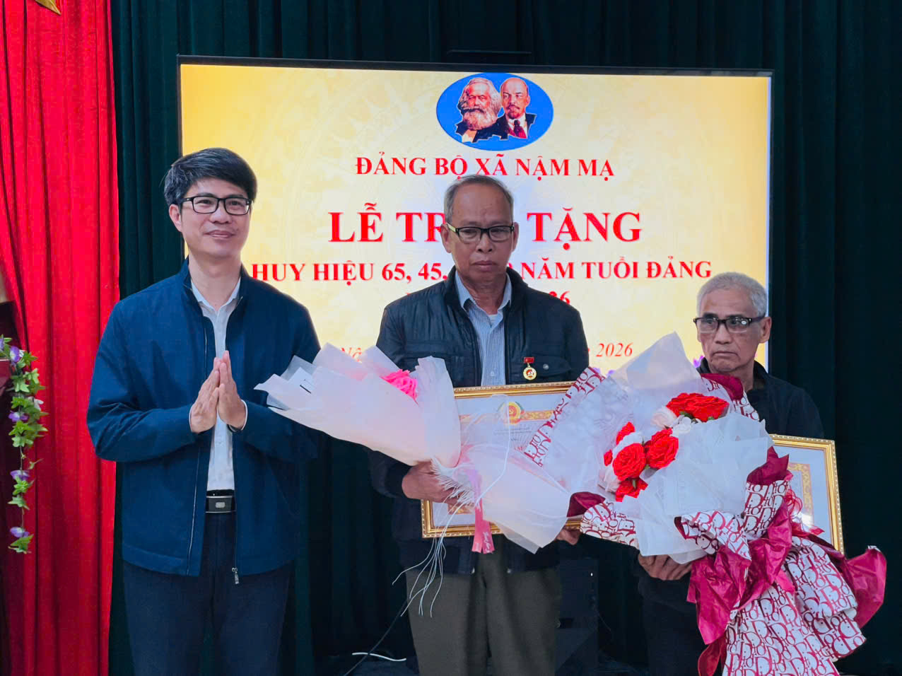 Đại diện lãnh đạo Đảng ủy, UBND xã Nậm Mạ trao Huy hiệu 45 tuổi Đảng cho các đảng viên.