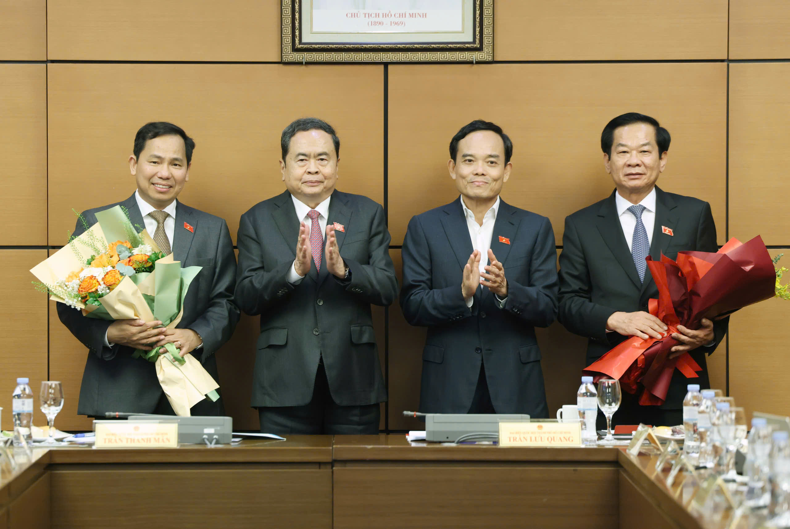 Chiều cùng ngày, Chủ tịch Quốc hội Trần Thanh Mẫn và Bí thư Thành ủy TPHCM Trần Lưu Quang tặng hoa, chúc mừng Tổng Thư ký Quốc hội, Chủ nhiệm Văn phòng Quốc hội Lê Quang Mạnh và Bộ trưởng Bộ Nội vụ Đỗ Thanh Bình. Ảnh: QUANG PHÚC