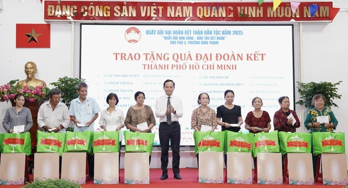 Bí thư Trung ương Đảng, Bí thư Thành ủy Thành phố Hồ Chí Minh Trần Lưu Quang tặng quà đại đoàn kết cho các hộ dân trên địa bàn Khu phố 5, phường Bình Thạnh (Ảnh: DUY PHÚ)