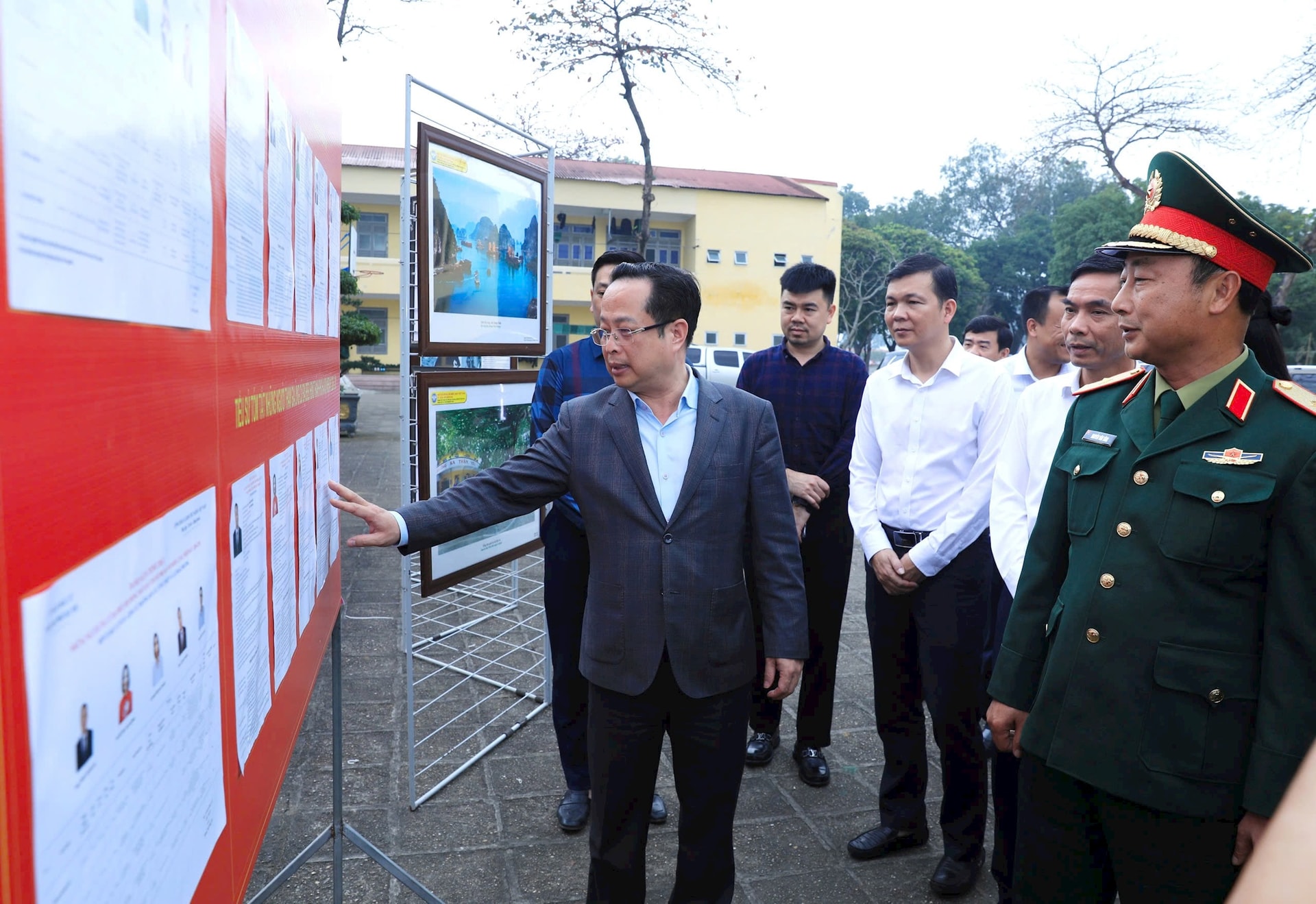 Đoàn công tác khảo sát việc niêm yết danh sách các ứng cử viên tại điểm bỏ phiếu Trường Sĩ quan Lục quân I, xã Đoài Phương. Ảnh: LH