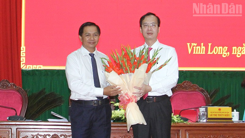 Bí thư Tỉnh ủy Vĩnh Long Trần Văn Lâu tặng hoa chúc mừng tân Chủ tịch Ủy ban nhân dân tỉnh Vĩnh Long Trần Trí Quang.