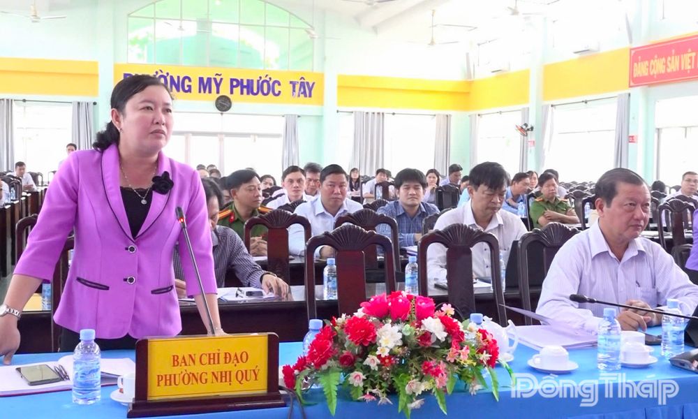 Đồng chí Võ Thị Búp, Bí thư Đảng ủy, Chủ tịch Hội đồng nhân dân phường Nhị Quý báo cáo tình hình, tiến độ triển khai công tác bầu cử trên địa bàn phường.