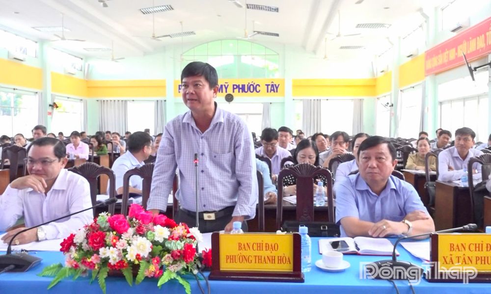 Đồng chí Đoàn Bảo Ngoan, Bí thư Đảng ủy, Chủ tịch Hội đồng nhân dân phường Thanh Hòa báo cáo công tác bầu cử trên địa bàn phường.