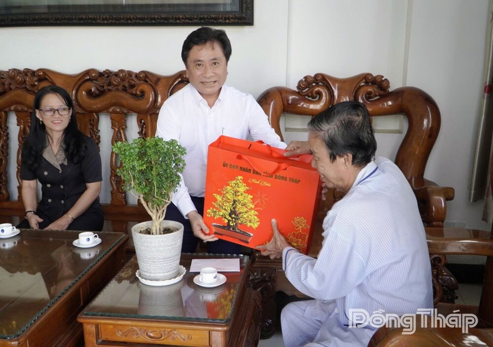 Phó Chủ tịch UBND tỉnh Đồng Tháp Trần Văn Dũng tặng quà cho cán bộ hưu trí trên địa bàn xã Lấp Vò.