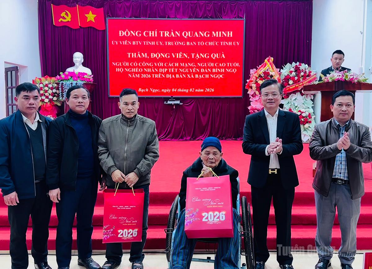 Đồng chí Trần Quang Minh, Ủy viên Ban Thường vụ Tỉnh ủy, Trưởng ban Tổ chức Tỉnh ủy trao quà Tết cho người cao tuổi xã Bạch Ngọc.