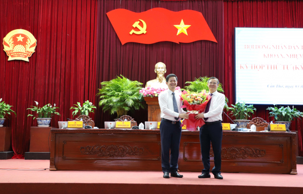 Đồng chí Lê Quang Tùng, Bí Thư Thành ủy Cần Thơ tặng hoa chúc mừng tân Chủ tịch UBND TP Cần Thơ Trương Cảnh Tuyên.