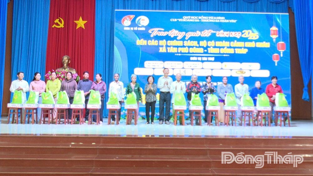 Tham dự buổi trao quà có các đồng chí: Trương Mỹ Hoa, nguyên Bí thư Trung ương Đảng, nguyên Phó Chủ tịch nước, Chủ tịch Quỹ học bổng Vừ A Dính, Chủ nhiệm Câu lạc bộ “Vì Hoàng Sa - Trường Sa thân yêu”; Bùi Thái Sơn, Tỉnh ủy viên, Bí thư Đảng ủy, Chủ tịch HĐND xã Tân Phú Đông cùng các nhà hảo tâm và đại diện 300 gia đình chính sách, hộ nghèo, hộ có hoàn cảnh khó khăn trên địa bàn xã Tân Phú Đông.