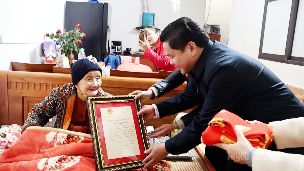 Đồng chí Vàng Seo Cón, Bí thư Đảng ủy, Chủ tịch HĐND phường Hà Giang 2 chúc thọ cụ Trần Thị Thoảng tròn 100 tuổi.