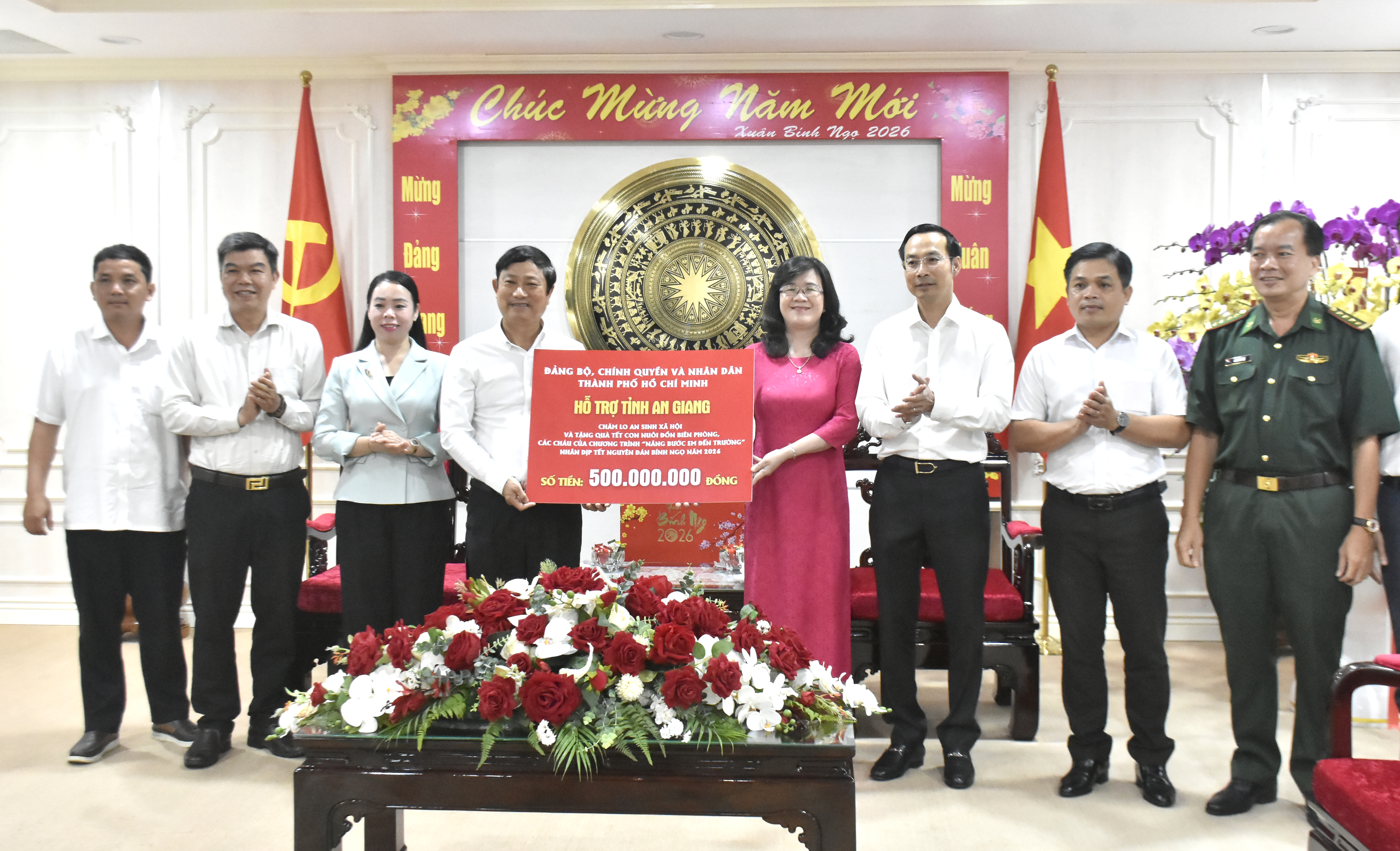 Dịp này, đồng chí Võ Văn Minh đã trao bảng tượng trưng kinh phí hỗ trợ 500 triệu đồng đến tỉnh An Giang. Trong đó, 400 triệu đồng (trích từ Quỹ “Vì người nghèo thành phố”) để tặng quà tết cho các gia đình chính sách, cán bộ, chiến sĩ, hộ nghèo, hộ cận nghèo, hộ có hoàn cảnh khó khăn; 100 triệu đồng (trích từ Quỹ “Vì biển đảo quê hương - Vì tuyến đầu Tổ quốc thành phố”) tặng quà tết cho con nuôi đồn biên phòng và các cháu trong chương trình “Nâng bước em đến trường”.