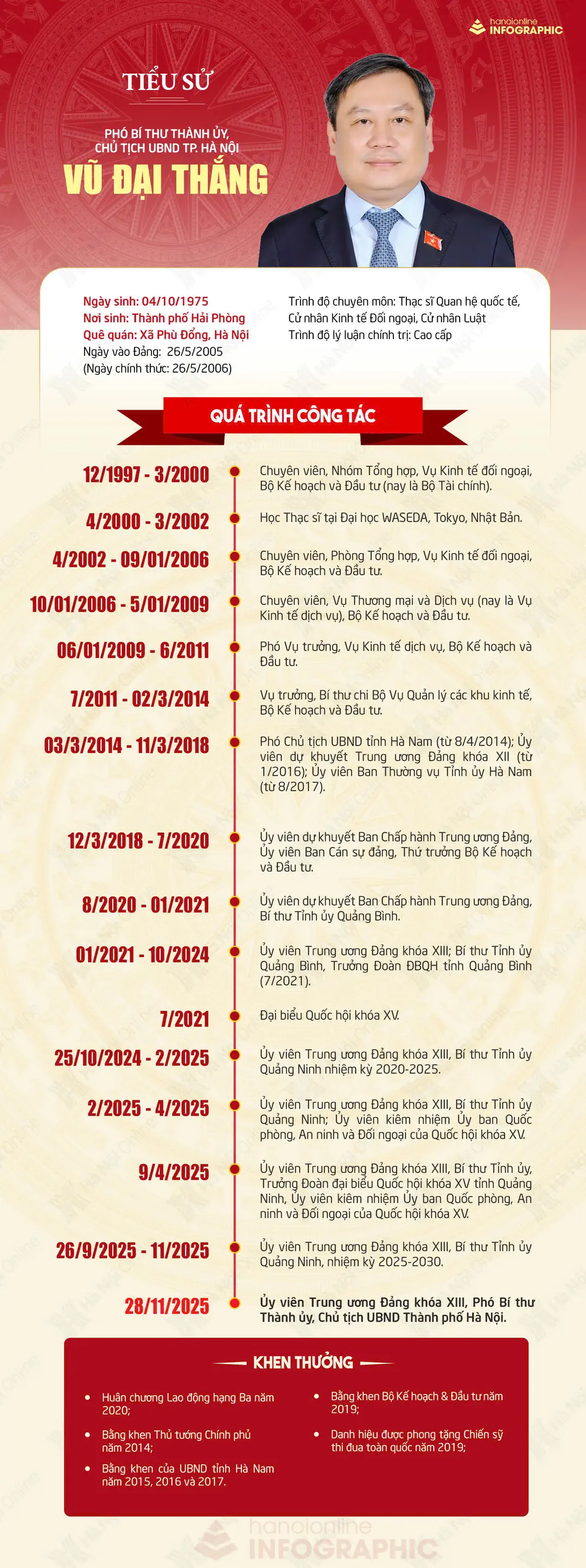 Phó Bí thư Thành ủy, Chủ tịch UBND thành phố Hà Nội Vũ Đại Thắng sinh ngày 4/10/1975, quê ở Gia Lâm, Hà Nội. Ông có trình độ cao cấp lý luận chính trị, đồng thời có nhiều bằng cấp chuyên môn như Thạc sĩ Quan hệ quốc tế, Cử nhân Kinh tế đối ngoại và Cử nhân Luật. Ông từng đảm nhiệm nhiều vị trí quan trọng tại Bộ Kế hoạch và Đầu tư (nay là Bộ Tài chính) trước khi giữ các cương vị lãnh đạo chủ chốt tại Hà Nam, Quảng Bình và Quảng Ninh. Từ năm 2021, ông là Ủy viên Trung ương Đảng khóa XIII và Đại biểu Quốc hội khóa XV. Tháng 10/2024, ông đảm nhiệm vị trí Bí thư Tỉnh ủy Quảng Ninh nhiệm kỳ 2020 - 2025; tháng 11/2025, ông tiếp tục giữ vị trí Bí thư Tỉnh ủy Quảng Ninh, nhiệm kỳ 2025 - 2030.