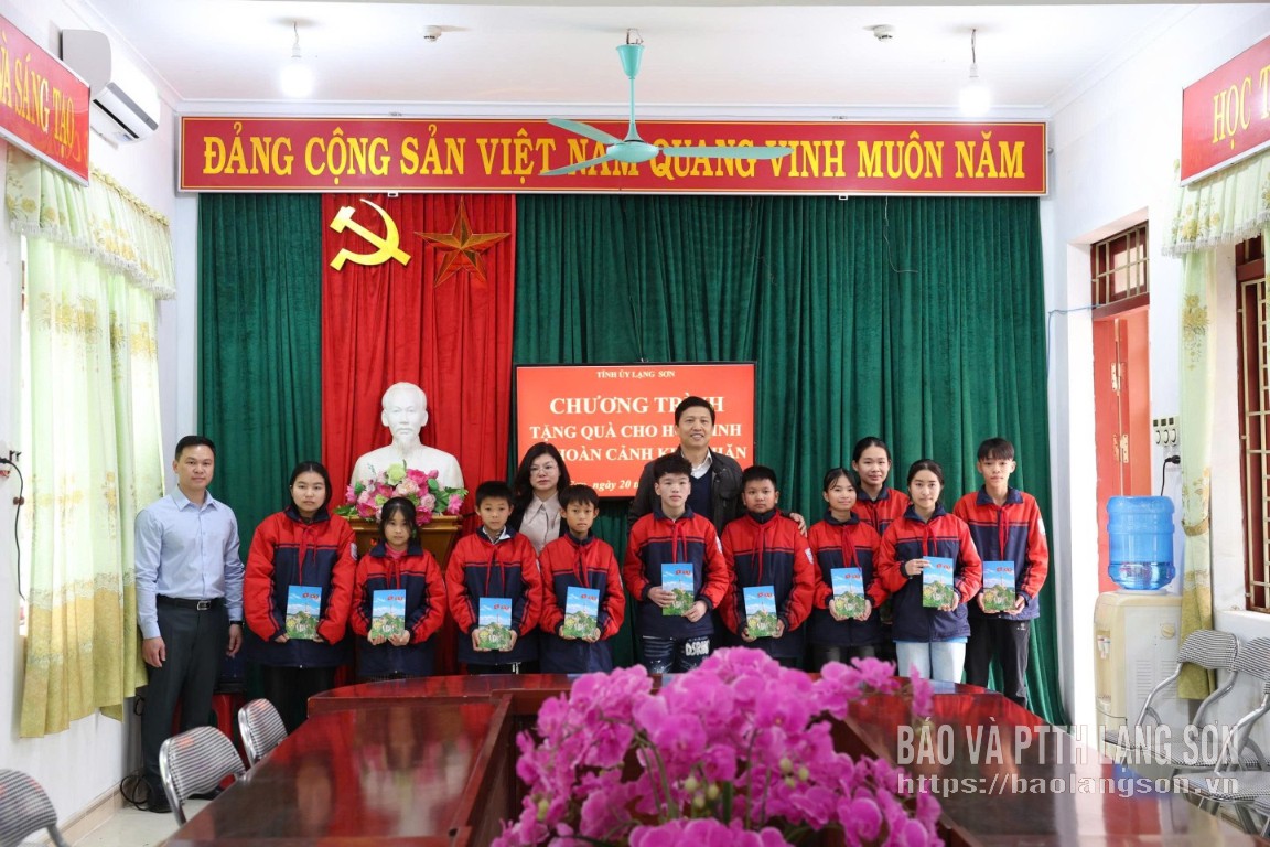 Đồng chí Vũ Hoàng Anh, Phó Bí thư Tỉnh ủy tặng quà học sinh Trường THCS Bắc Quỳnh, xã Bắc Sơn