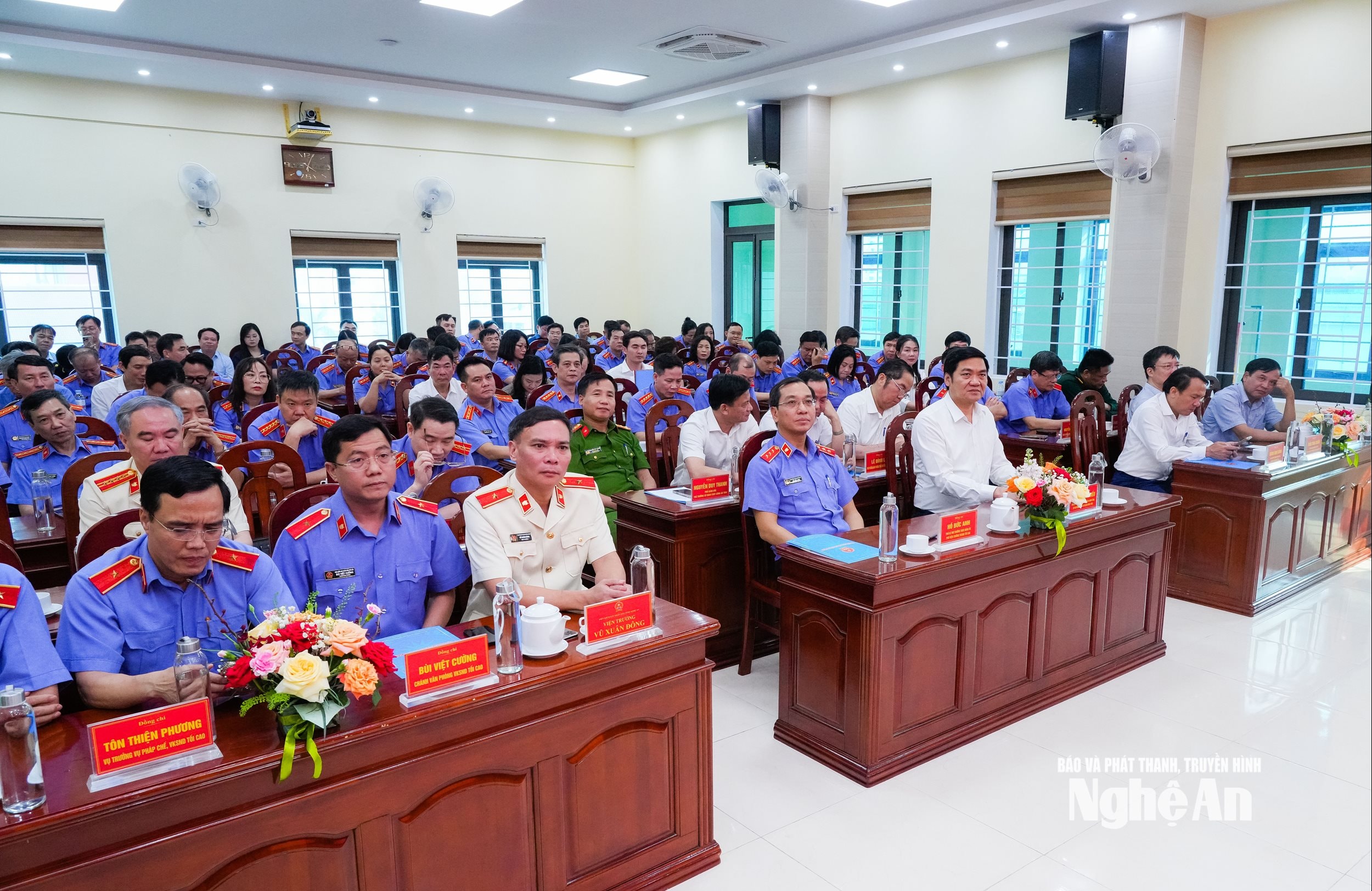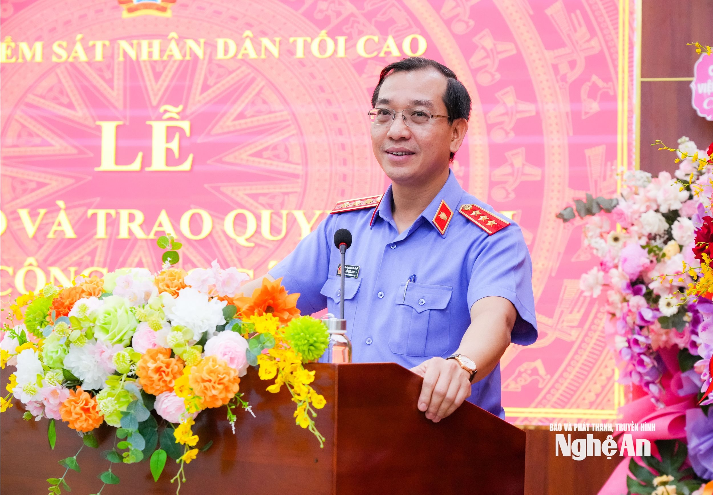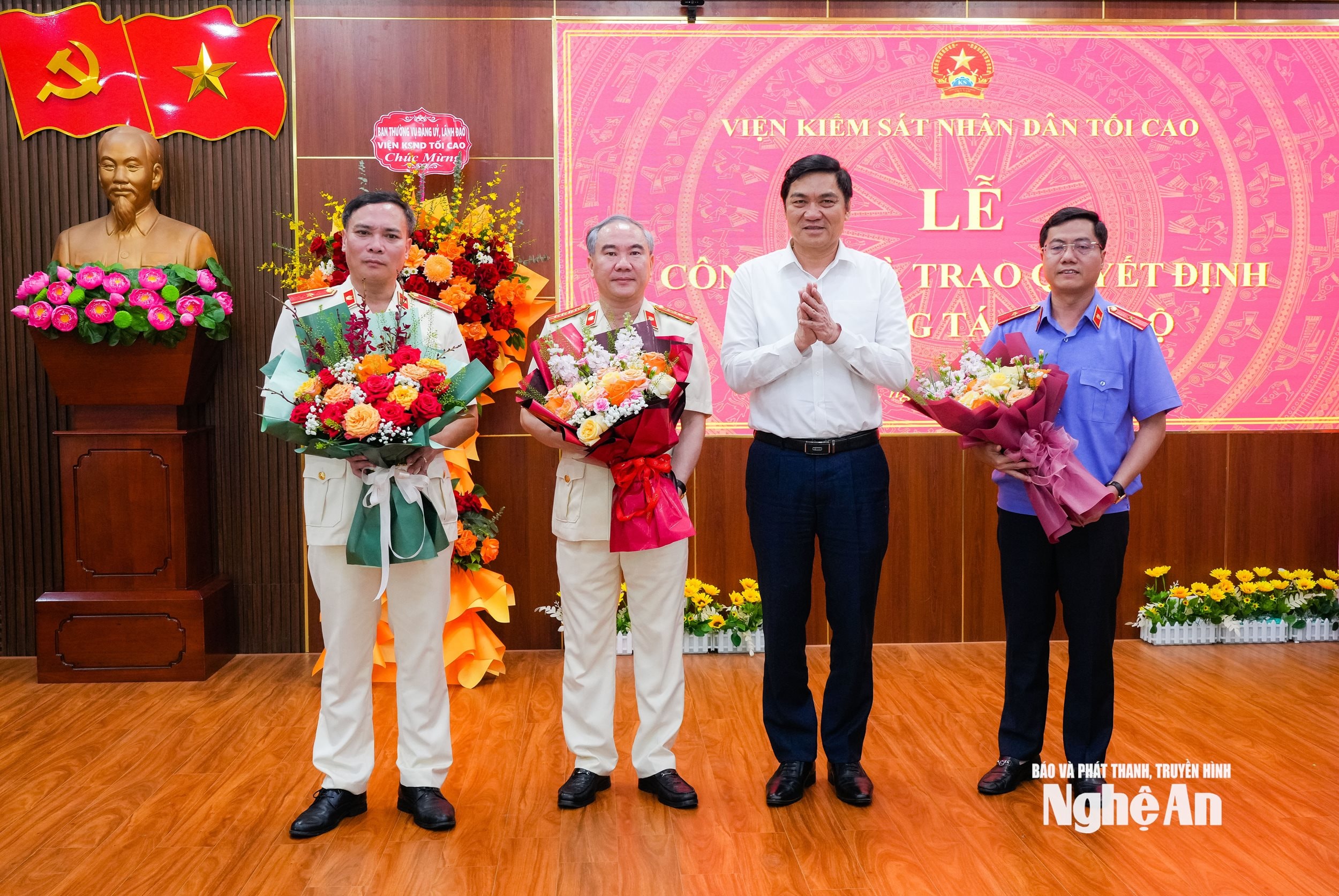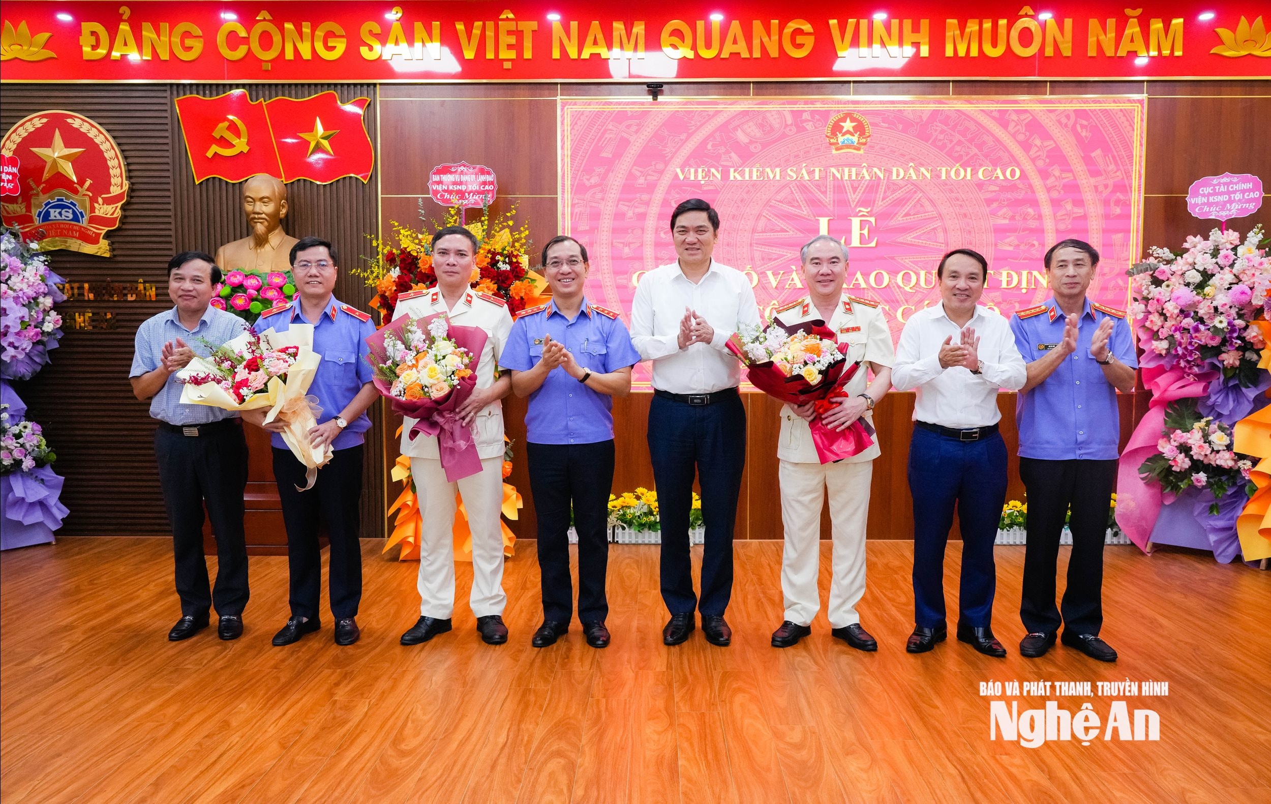 Lãnh đạo Viện Kiểm sát tối cao và lãnh đạo tỉnh Nghệ An tặng hoa chúc mừng các đồng chí được bổ nhiệm. Ảnh: Thanh Lê