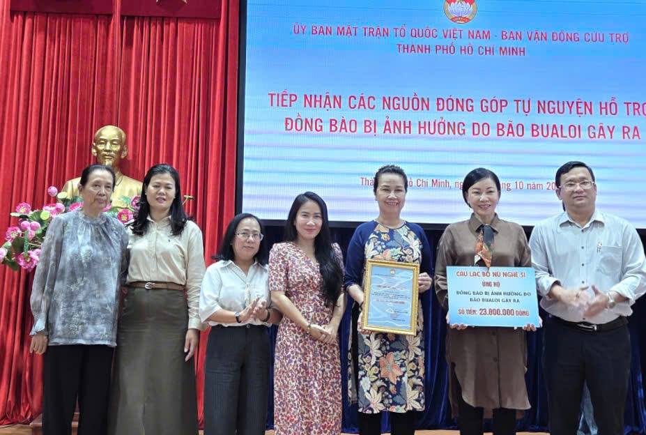Trong những ngày qua, bão số 10 gây thiệt hại lớn về người và tài sản, khiến cuộc sống của hàng nghìn hộ dân rơi vào cảnh khó khăn. Hưởng ứng lời kêu gọi hỗ trợ, nhiều nghệ sĩ TP Hồ Chí Minh, đại diện Liên hiệp các Hội Văn học - Nghệ thuật, các Hội chuyên ngành, Câu lạc bộ Nữ nghệ sĩ và Đội tình nguyện viên Nghệ sĩ Thành phố đã trực tiếp đến Ủy ban Mặt trận Tổ quốc (UBMTTQ) Việt Nam Thành phố để quyên góp.