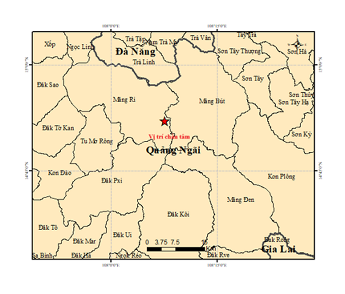 Vị trí chấn tiêu trận động đất tại xã Măng Ri, tỉnh Quảng Ngãi