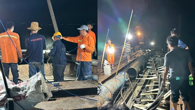 Cán bộ, kỹ sư công nhân EVNSPC, PC An Giang và các đơn vị liên quan khẩn trương thi công ngày, đêm để khắc phục sự cố cáp ngầm 110kV Hà Tiên-Phú Quốc, khôi phục cấp điện hoàn toàn cho đặc khu Phú Quốc.