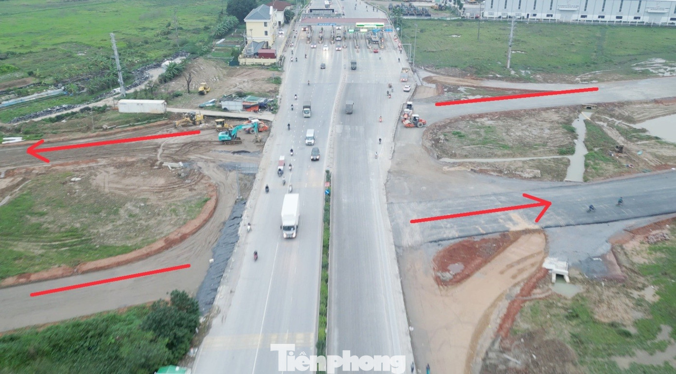 Dự án đường Vành đai 4 đang thi công đường song hành qua tỉnh Hưng Yên, hiện đường dự án (mũi tên màu đỏ) giao với QL5 (sát trạm thu phí số 1 đoạn tại xã Như Quỳnh, Hưng Yên). Trước thời điểm cuối tuần này, đường dự án đang có nhiều ô tô, xe tải đi vào..