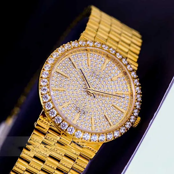 Mặt số tròn 29mm là kích thước lý tưởng cho cổ tay phụ nữ Việt, được đính đá Swarovski chính hãng tại 12 cọc số và viền bezel, tạo hiệu ứng lấp lánh tinh tế mỗi khi Hari Won cử động tay. Kính sapphire nguyên khối chống xước gần như tuyệt đối, vỏ và dây làm từ thép không gỉ 316L cao cấp với lớp mạ PVD vàng gold bóng bẩy. Thiết kế tối giản, không số thừa, mang đến vẻ đẹp thanh lịch phù hợp với mọi trang phục từ áo dài truyền thống đến váy dạ hội.