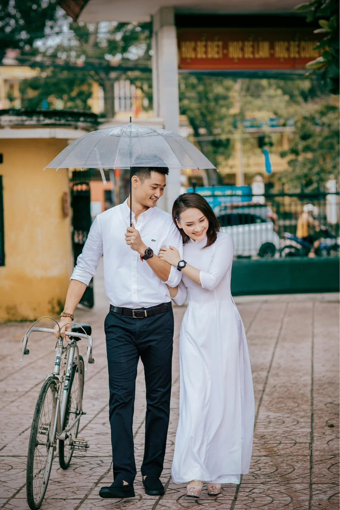 Bảo Thanh e ấp bên chồng khi diện áo dài trắng. Ảnh: FBNV