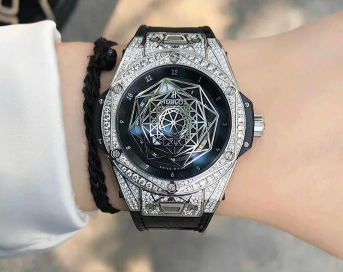 Sự xa xỉ và độc đáo của chiếc đồng hồ Đỗ Thị Hà sở hữu thể hiện rõ qua chất liệu và thiết kế. Vỏ ngoài làm bằng titanium, vật liệu nổi tiếng về độ bền và nhẹ, nhưng được nâng tầm giá trị nhờ kỹ thuật Full Diamond Pave Setting. Toàn bộ bề mặt vỏ, vành bezel và thậm chí cả các chi tiết hình học trên mặt số đều được đính kim cương tự nhiên, tạo nên hiệu ứng lấp lánh mạnh mẽ, tương phản với tông màu đen tổng thể.