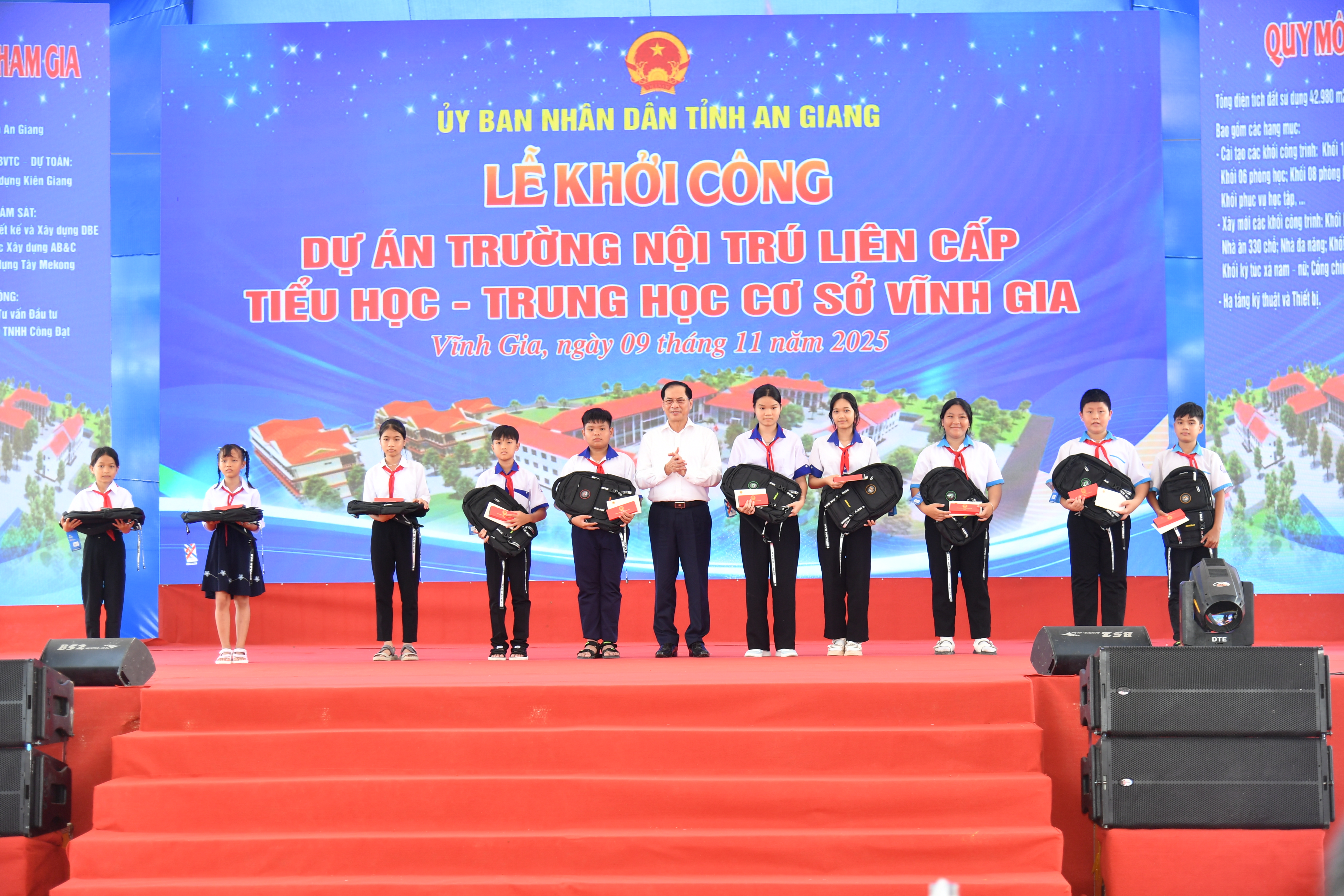 Tại buổi lễ, Phó Thủ tướng Bùi Thanh Sơn cùng các đại biểu thực hiện nghi thức khởi công, đồng thời trao tặng 20 suất học bổng cho học sinh vượt khó, học giỏi, và 10 phần quà đến giáo viên có hoàn cảnh khó khăn.