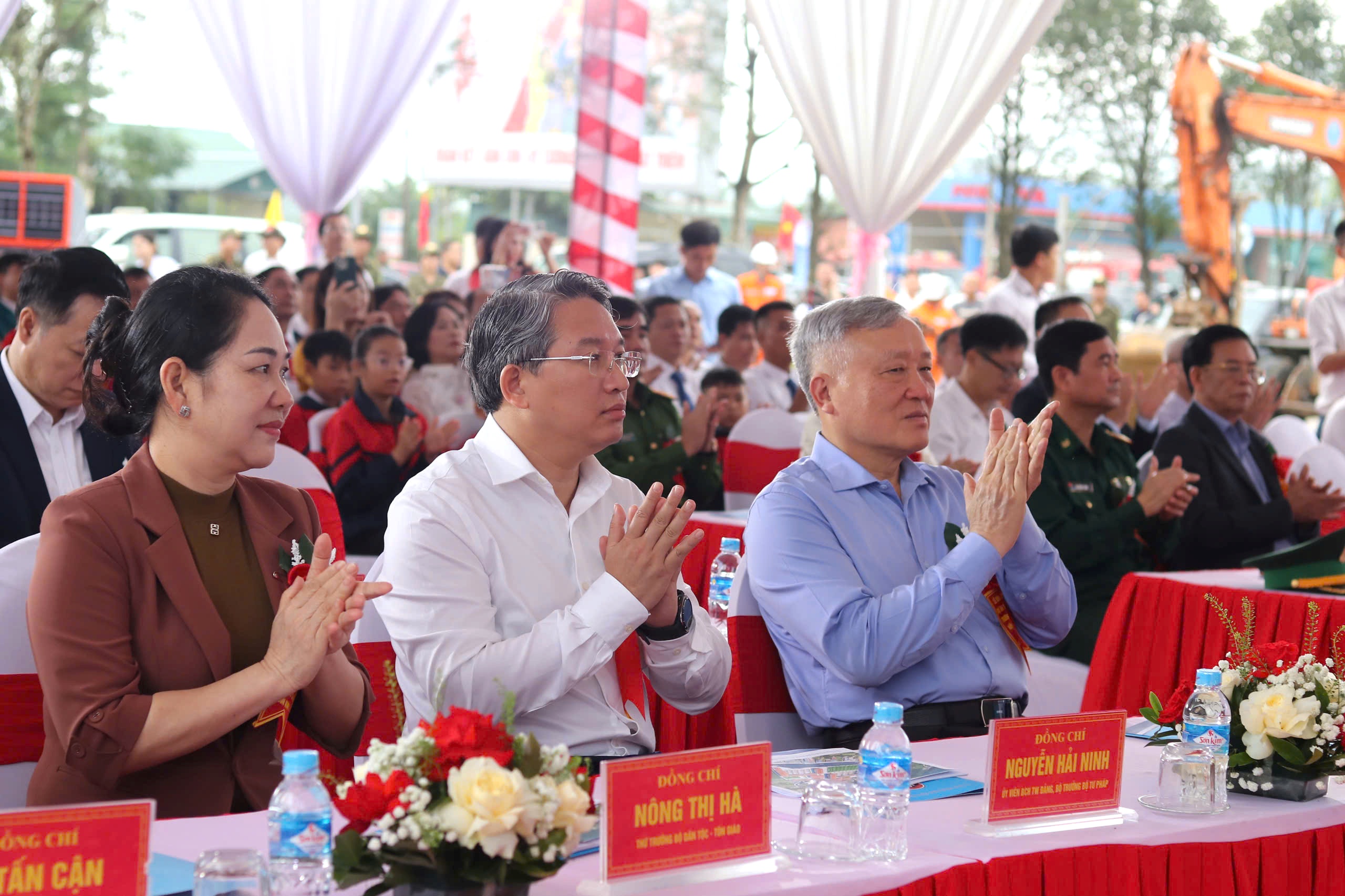 Phó Thủ tướng Thường trực Chính phủ Nguyễn Hòa Bình, Bộ trưởng Bộ Tư pháp Nguyễn Hải Ninh dự lễ khởi công dự án Trường Phổ thông nội trú liên cấp Tiểu học – THCS Sơn Kim 1, tỉnh Hà Tĩnh. Ảnh: DƯƠNG QUANG