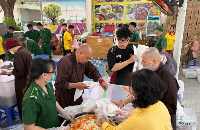 Ngoài các nhân sự là Tăng Ni, Phật tử từ TP.HCM, phục vụ tại các bếp còn có nhân sự tại chỗ là các cán bộ, chiến sĩ, Tăng Ni sinh Trường Trung cấp Phật học Khánh Hòa.