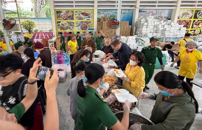 Tham gia điều hành các bếp dã chiến phục vụ đồng bào là các vị có nhiều kinh nghiệm phục vụ trong đại dịch Covid-19: Ni trưởng Thích nữ Huệ Tuyến, Đại đức Thích Minh Phú… cùng các cộng sự thuộc Ban Từ thiện xã hội Phật giáo TP.HCM.
