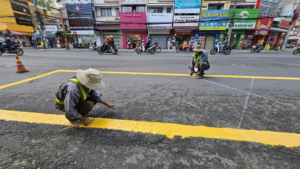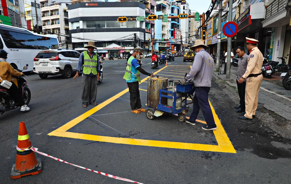 Các đơn vị kẻ vạch mắt võng tại nút giao Hải Thượng - Ba Tháng Hai chiều 13-11