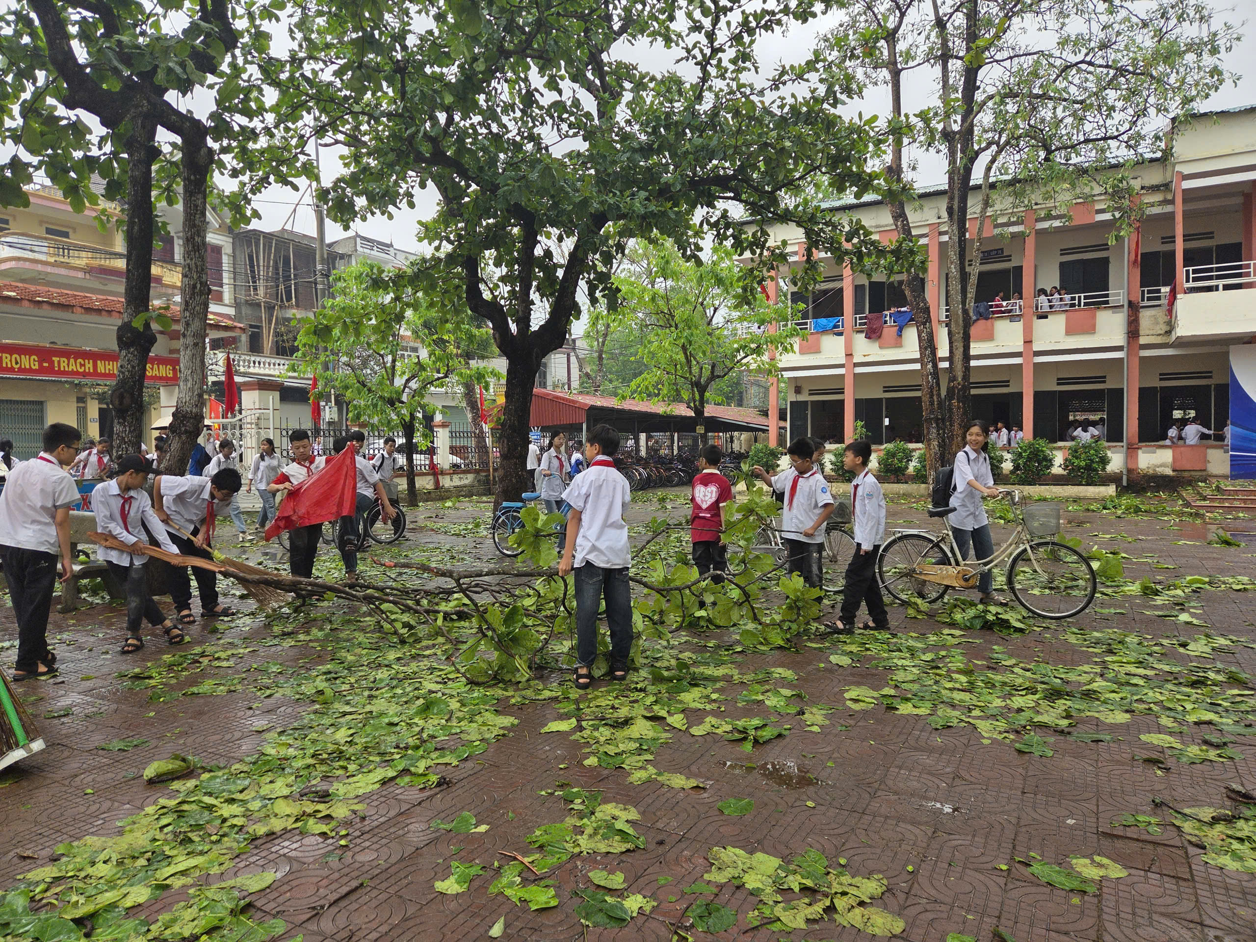 Học sinh dọn vệ sinh sau ảnh hưởng dông lốc