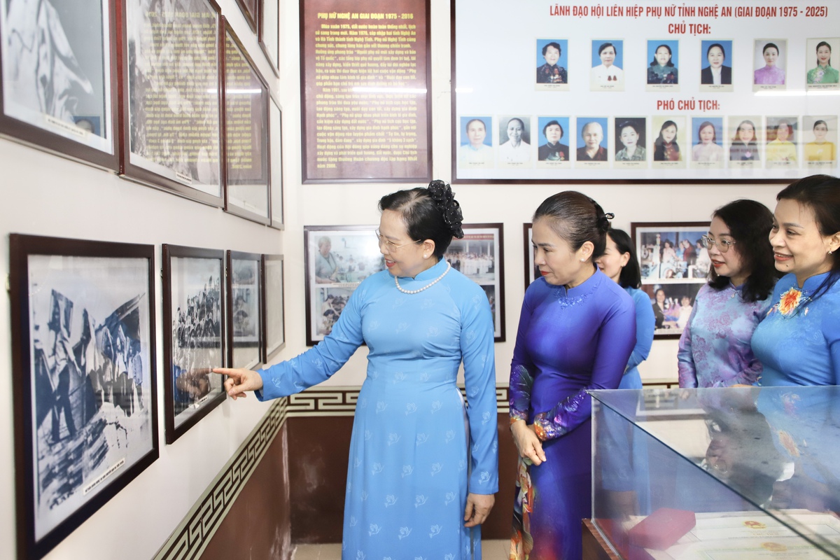 Ủy viên TƯ Đảng, Bí thư Đảng ủy, Chủ tịch Hội LHPN Việt Nam Lê Thị Thủy (bên trái) và các đại biểu tham quan nhà truyền thống Hội LHPN tỉnh Nghệ An