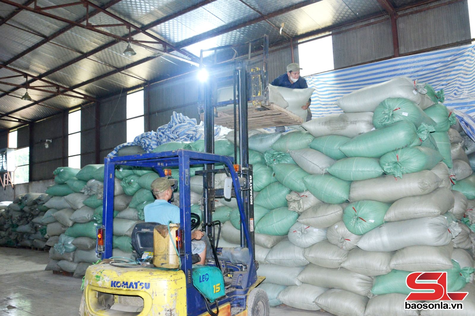 Công nhân cơ sở chế biến chè bản Liên Hưng, xã Tô Múa thu gom sản phẩm chè phục vụ tiêu thụ.
