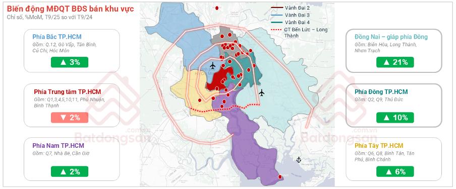 Ở phân khúc đất nền, thị trường phía Đông TP.HCM cũng đang hồi phục. Mức độ quan tâm tại khu vực này trong tháng 9/2025 tăng 6% so với tháng 4/2025, cao hơn phía Tây (+3%) và phía Bắc (+5%), trái ngược xu hướng giảm ở phía Nam.