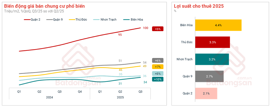 Điểm sáng thị trường bất động sản giáp ranh phía Đông TP.HCM còn nằm ở lợi suất cho thuê chung cư. Trong khi Quận 2 đạt mức 2,1%, Quận 9 khoảng 2,7% và Thủ Đức đạt 3,3%, thì Biên Hòa vươn lên dẫn đầu với 4,4%, tiếp đến là Nhơn Trạch 3,2%.
