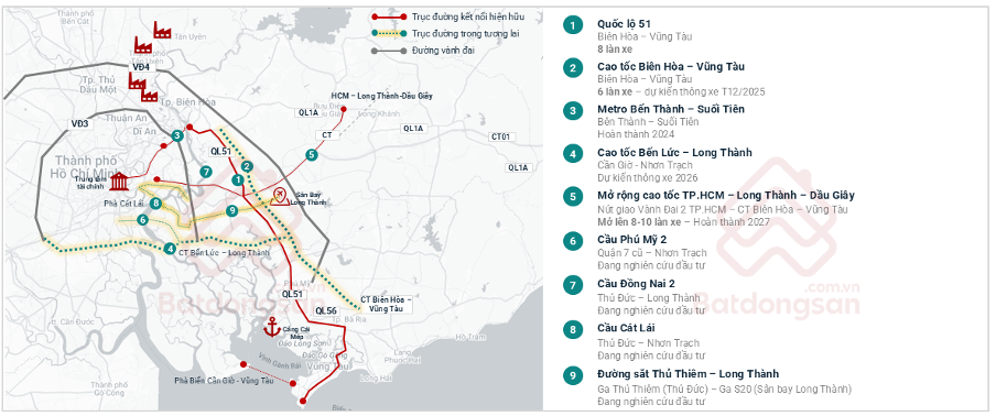Đồng Nai có vị trí chiến lược trong bức tranh đô thị mở rộng và logistics cảng biển – sân bay phía Đông TP. HCM. Hàng loạt dự án hạ tầng trọng điểm đang dần thay đổi diện mạo khu Đông gồm: sân bay quốc tế Long Thành, cảng Cái Mép - Thị Vải, cao tốc Biên Hòa - Vũng Tàu, TP.HCM - Long Thành - Dầu Giây, cầu Cát Lái, cầu Phú Mỹ 2, cầu Đồng Nai 2, tuyến đường sắt Thủ Thiêm - Long Thành…