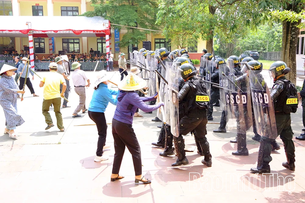 Ở phần thực binh, các lực lượng vũ trang xã phối hợp xử trí tình huống A2; Trung đội dân quân cơ động hiệp đồng với đơn vị chủ lực tiến công địch lâm thời phòng ngự ở địa hình rừng núi. Đây là nội dung khó, yêu cầu cao, thể hiện rõ năng lực tổ chức chỉ huy, hiệp đồng tác chiến và khả năng xử trí tình huống linh hoạt, sát thực tiễn.