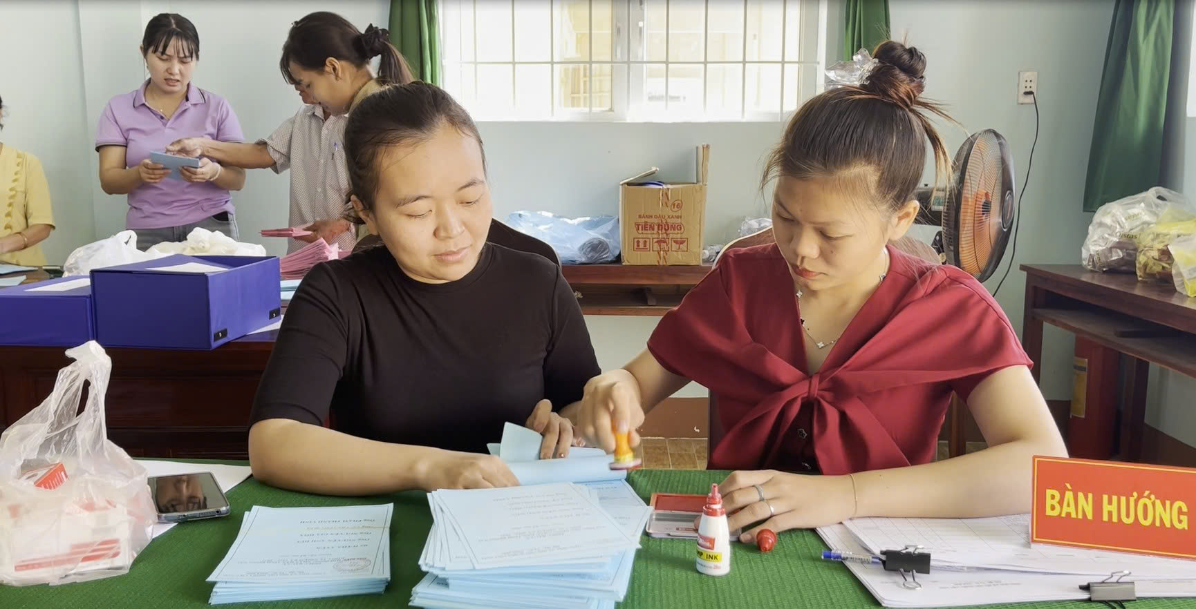 Thành viên tổ bầu cử tại xã Lộc Quang đóng dấu phiếu cử tri