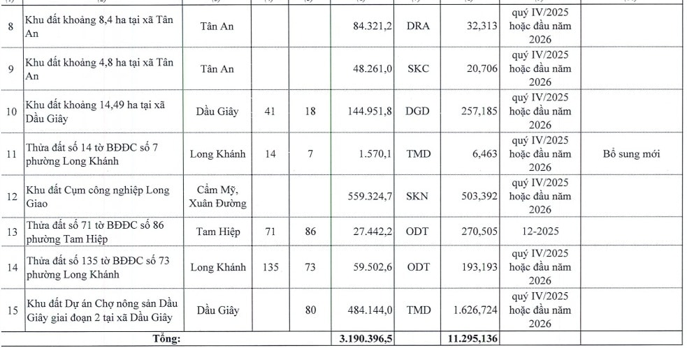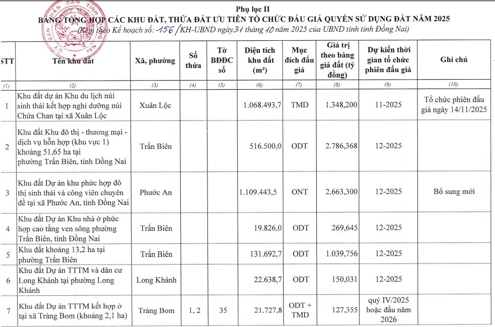 Theo Kế hoạch 156/KH-UBND, trong quý IV/2025, tỉnh Đồng Nai giao Trung tâm PTQĐ sẽ thực hiện đấu giá QSDĐ đối với 35 khu đất, thửa đất với diện tích khoảng 398,8ha và giá trị theo Bảng giá đất khoảng hơn 12.796 tỷ đồng.
