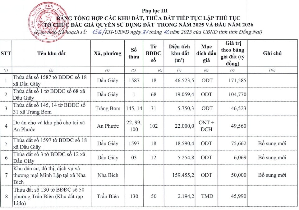 Trước đó, ngày 31/10, UBND tỉnh Đồng Nai ban hành Kế hoạch số 156/KH-UBND về đấu giá QSDĐ trên địa bàn tỉnh năm 2025.