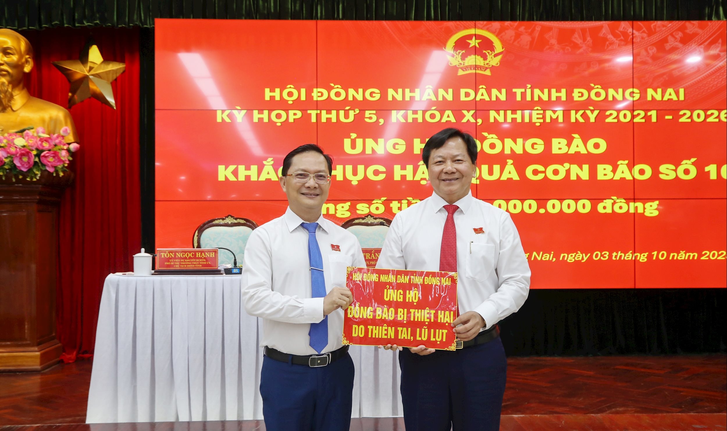 Tại Kỳ họp, HĐND tỉnh Đồng Nai đã trao số tiền 75 triệu đồng do các đại biểu quyên góp ủng hộ đồng bào khắc phục hậu quả bão số 10. Ảnh: Văn Dũng