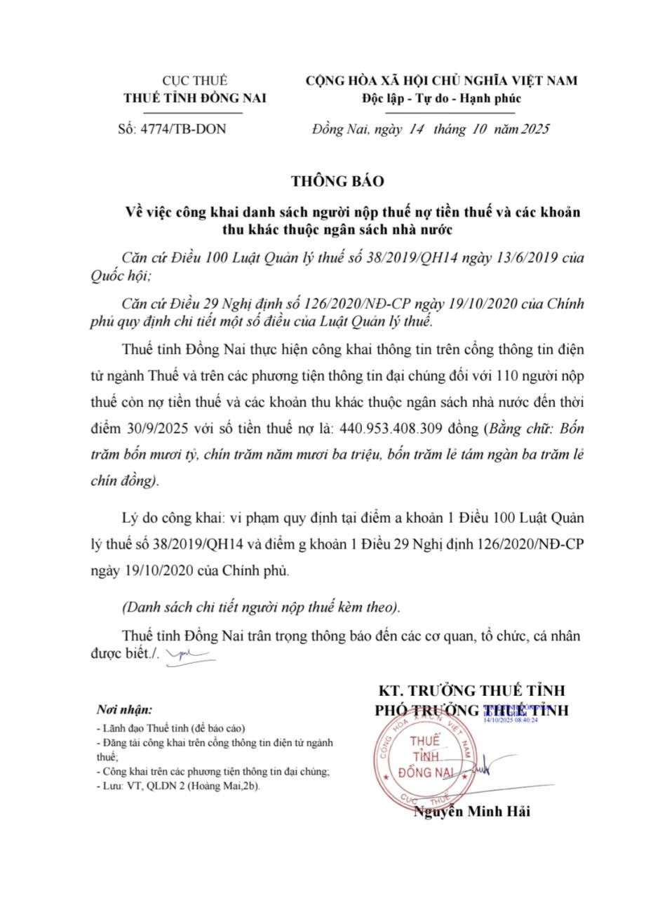 Đáng chú ý, Công ty TNHH Khu đô thị Phú Hội "đứng đầu" danh sách với số nợ thuế hơn 91,4 tỷ đồng. Tiếp đến là các doanh nghiệp có số nợ thuế lớn như: Công ty CP Đầu tư Boss City nợ 62,5 tỷ đồng; Công ty CP Tập đoàn Địa ốc Kim Oanh nợ 61,1 tỷ đồng; Công ty CP Công trình giao thông Đồng Nai nợ 55,7 tỷ đồng; Công ty CP Tập đoàn Tân Mai nợ hơn 30 tỷ đồng; Công ty TNHH Re Xam A.B.M (hơn 18,4 tỷ đồng); Công ty CP Việt Bo Việt (13,7 tỷ đồng); Công ty CP Xuất nhập khẩu Vi Na Đại Việt (11 tỷ đồng); Công ty CP Tân Vĩnh Cửu (10,4 tỷ đồng); Công ty TNHH Thuận Lợi Hưng Thịnh (10,3 tỷ đồng); Công ty TNHH Đức Phát (10 tỷ đồng)... Các đơn vị còn lại có số tiền thuế nợ dưới 10 tỷ đồng.