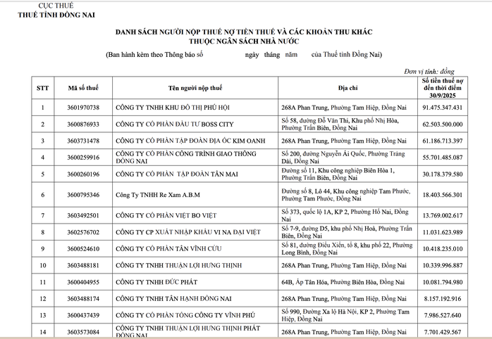 Theo thông báo, tính đến thời điểm 30-9-2025, danh sách đứng đầu nợ thuế là Công ty TNHH Khu đô thị Phú Hội (phường Tam Hiệp, tỉnh Đồng Nai) với hơn 91,4 tỉ đồng.