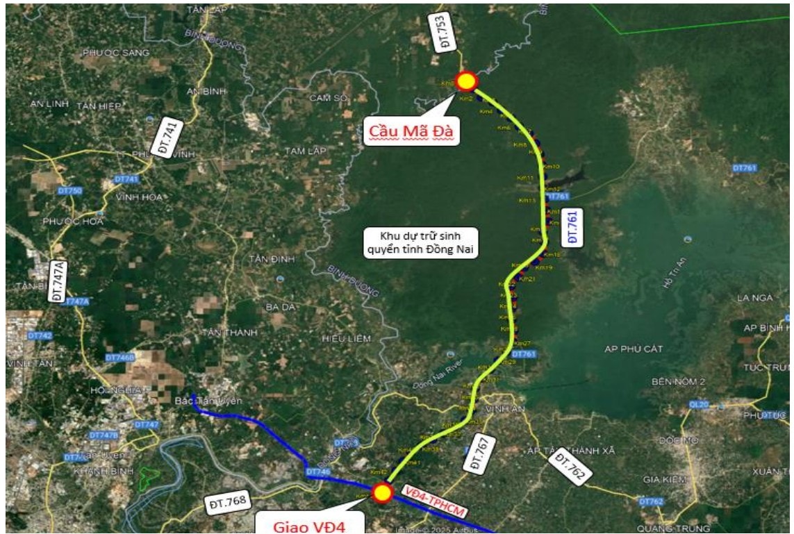 Vị trí và hướng tuyến Dự án Đường kết nối từ cầu Mã Đà đến Vành đai 4 - Thành phố Hồ Chí Minh. Ảnh đồ họa