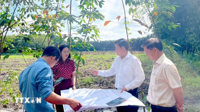 Lãnh đạo xã Nha Bích, tỉnh Đồng Nai kiểm tra thực địa công tác giải phóng mặt bằng Dự án cao tốc Bắc - Nam phía Tây, đoạn Gia Nghĩa - Chơn Thành tại khu vực ấp Minh Lập 4 xã Nha Bích. (Ảnh: Nhật Bình/TTXVN)