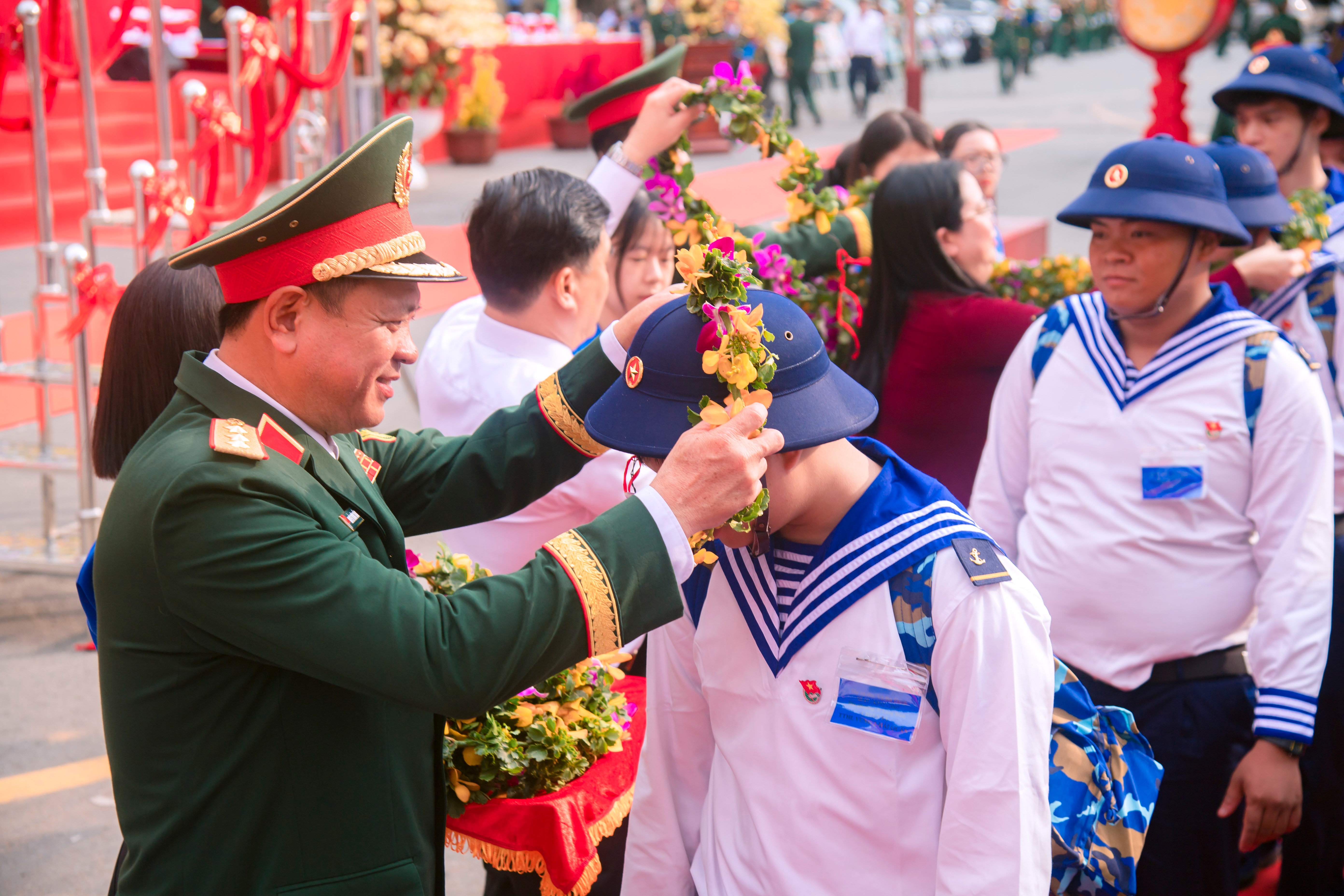 Phó Bí thư Thường trực Tỉnh ủy, Chủ tịch HĐND tỉnh Đồng Nai Tôn Ngọc Hạnh đeo vòng nguyệt quế và động viên các tân binh