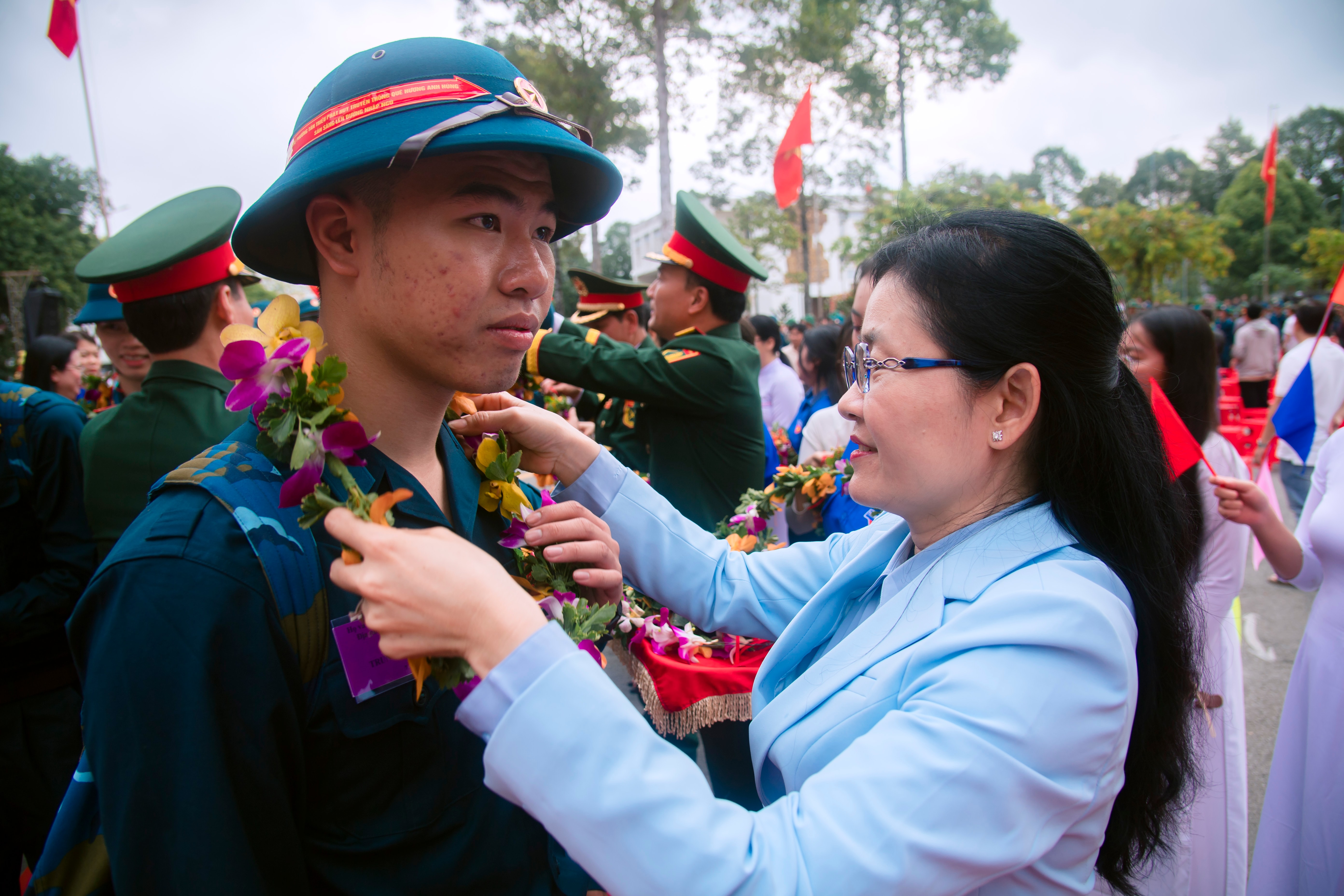 Chủ tịch UBND tỉnh Đồng Nai Nguyễn Văn Út đeo vòng nguyệt quế, động viên các chiến sĩ trẻ trước khi lên xe về đơn vị