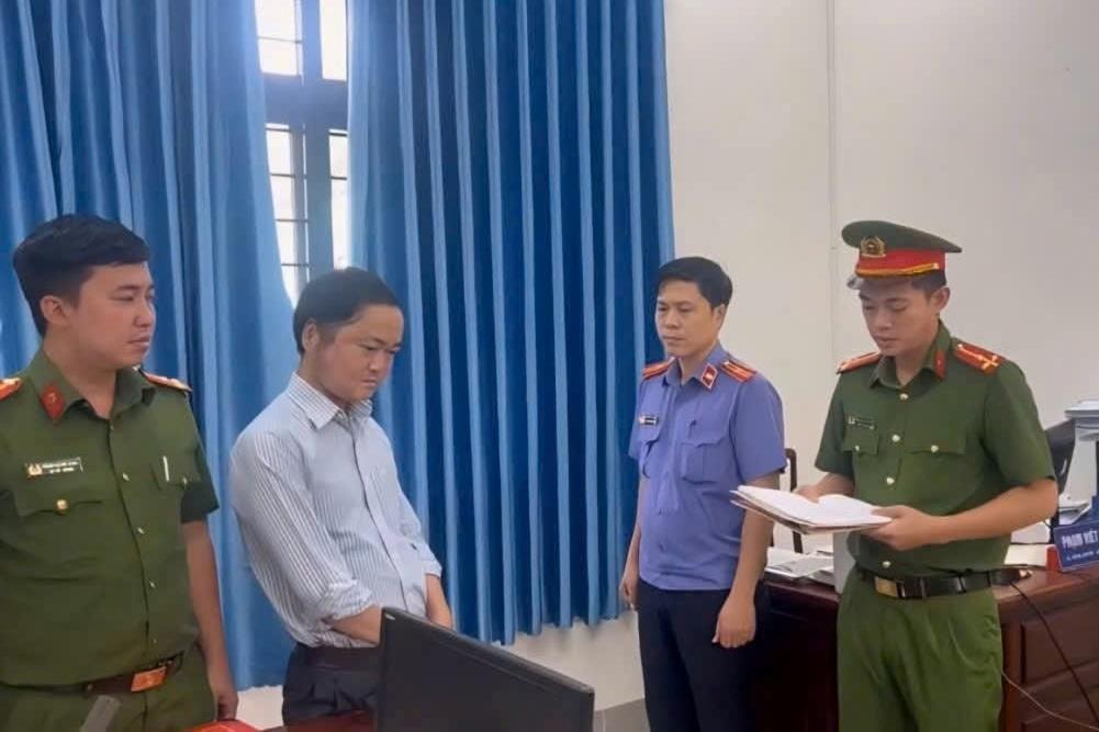 Cơ quan điều tra đọc quyết định bắt tạm giam bị can Phạm Viết Dực. Ảnh công an cung cấp