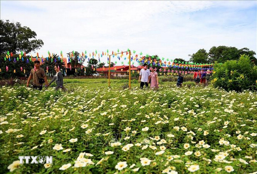 Du khách dạo chơi trong cánh đồng hoa tại khu du lịch sinh thái Đảo Ó-Đồng Trường. (Ảnh: Hồng Đạt/TTXVN)