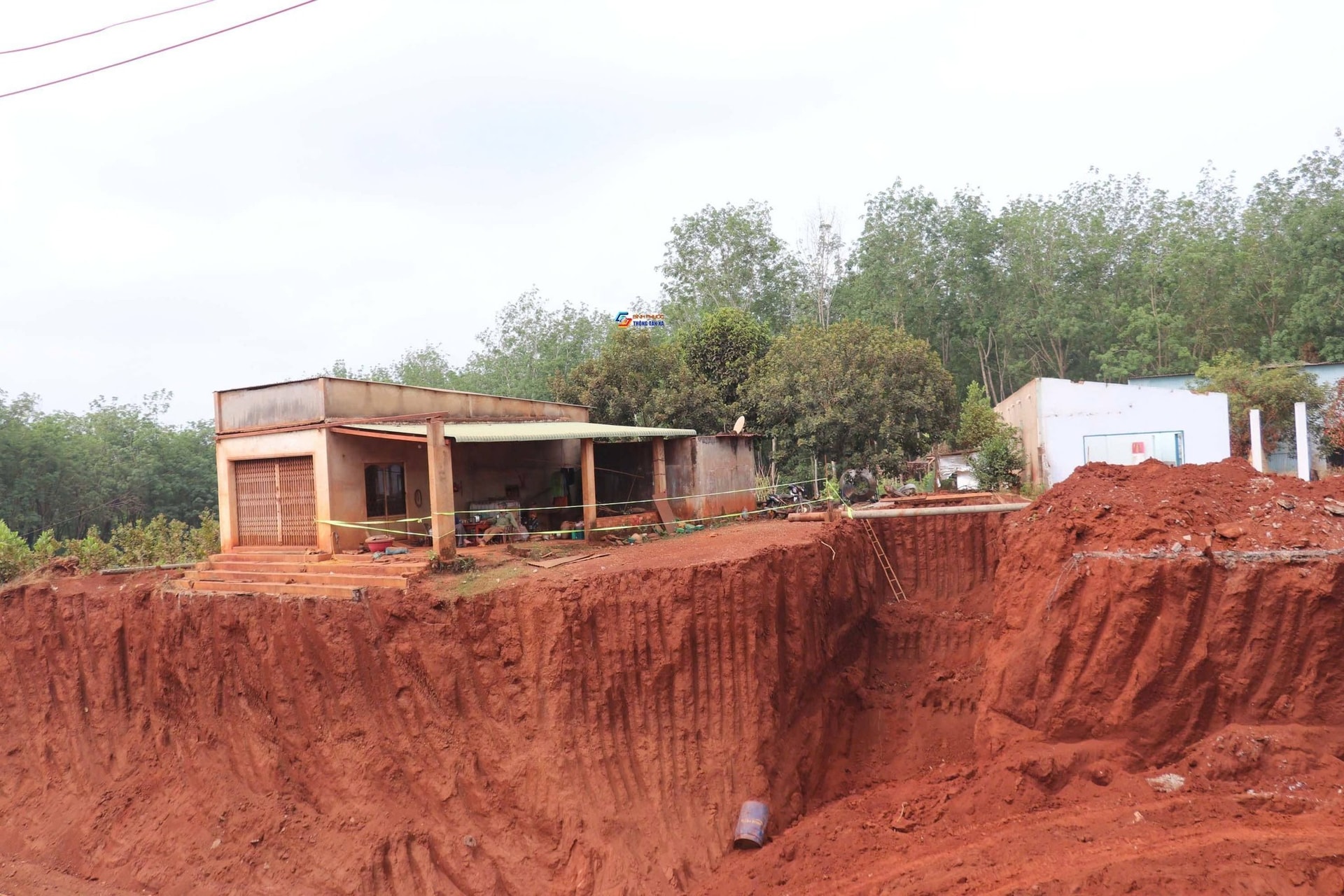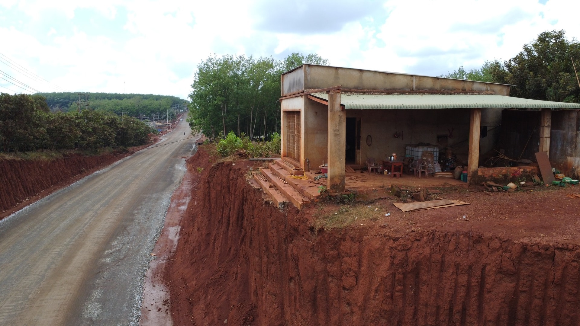 Một nhà dân có mặt tiền đường ĐT 753; giờ đây, đường thì sâu 8m, nhà thì bị... "thượng" lên cheo leo trên đỉnh đồi. Ảnh: Đ.T.T