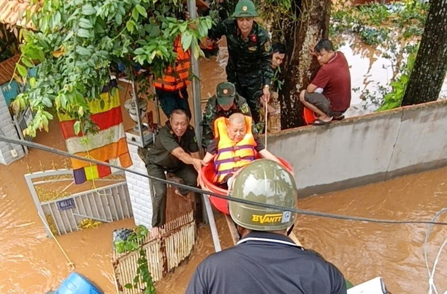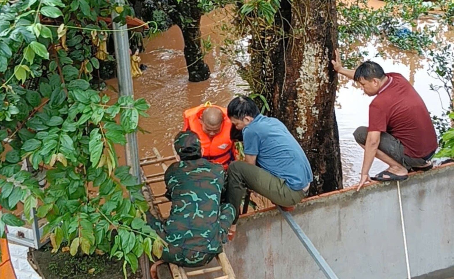 Lực lượng địa phương hỗ trợ người dân rời vùng ngập lụt. Ảnh: Nhóm LKCT.
