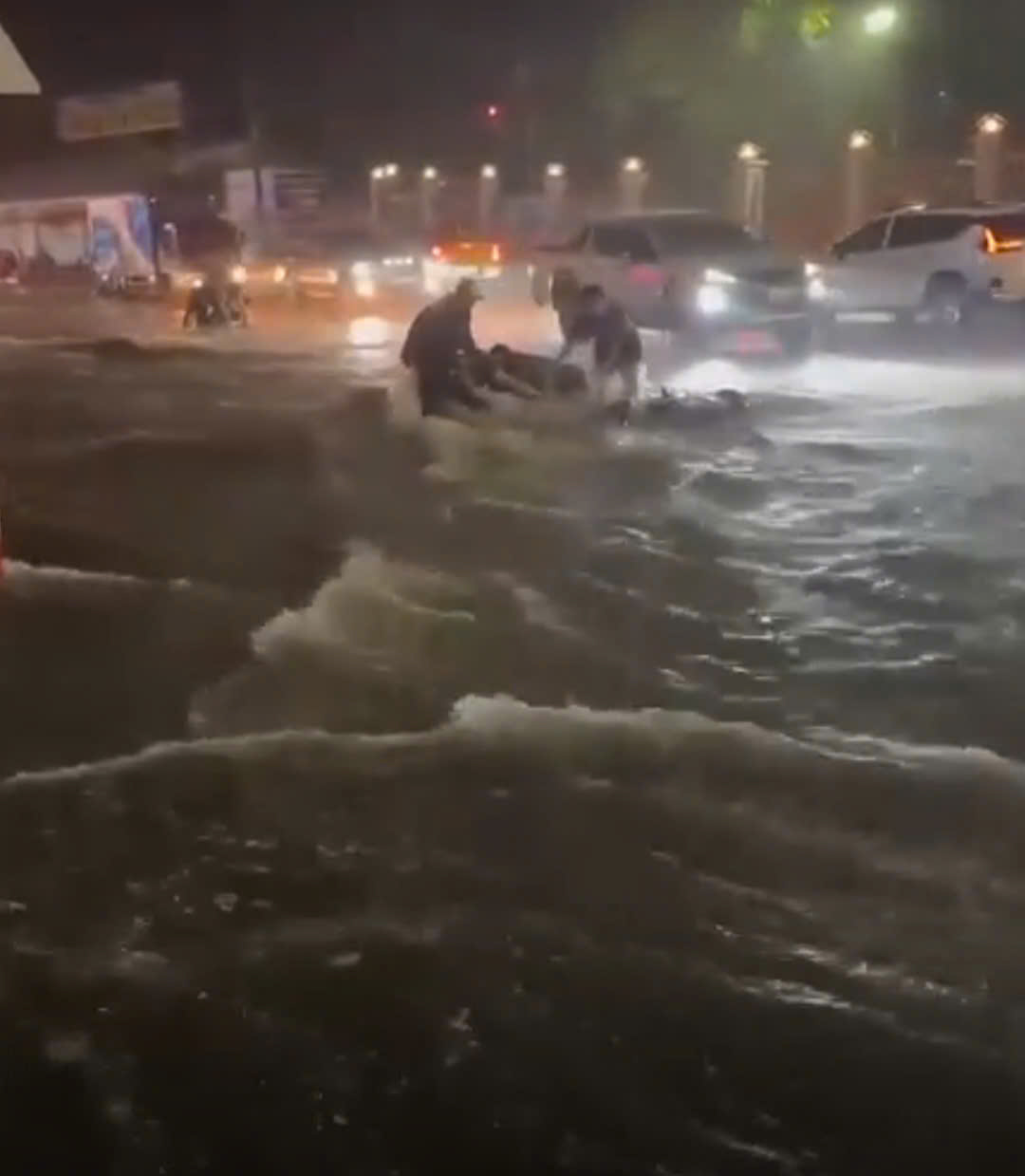 Nhiều phương tiện di chuyển khó khăn do nước ngập, tạo dòng chảy xiết